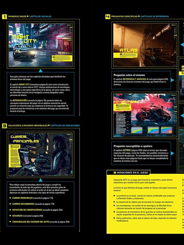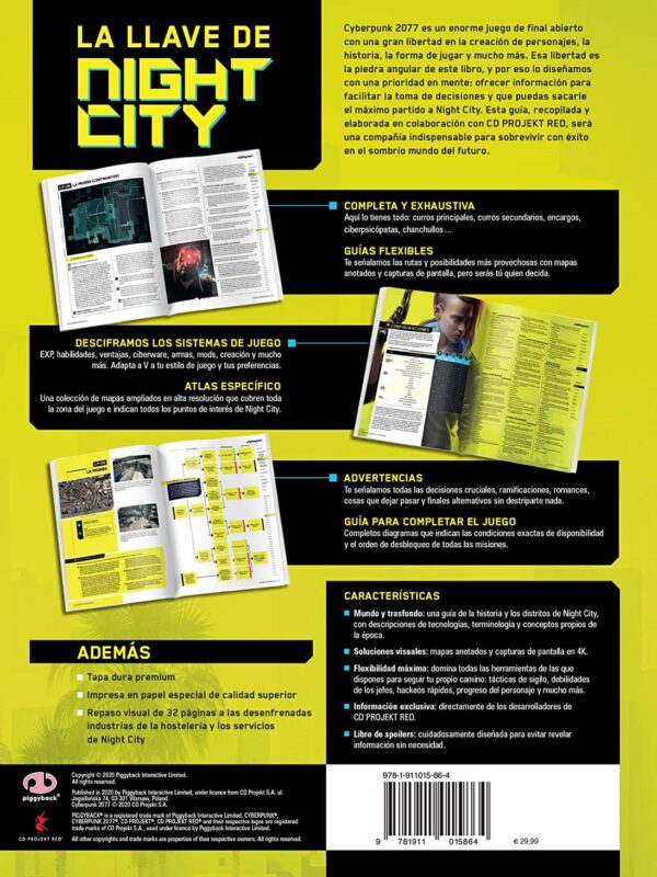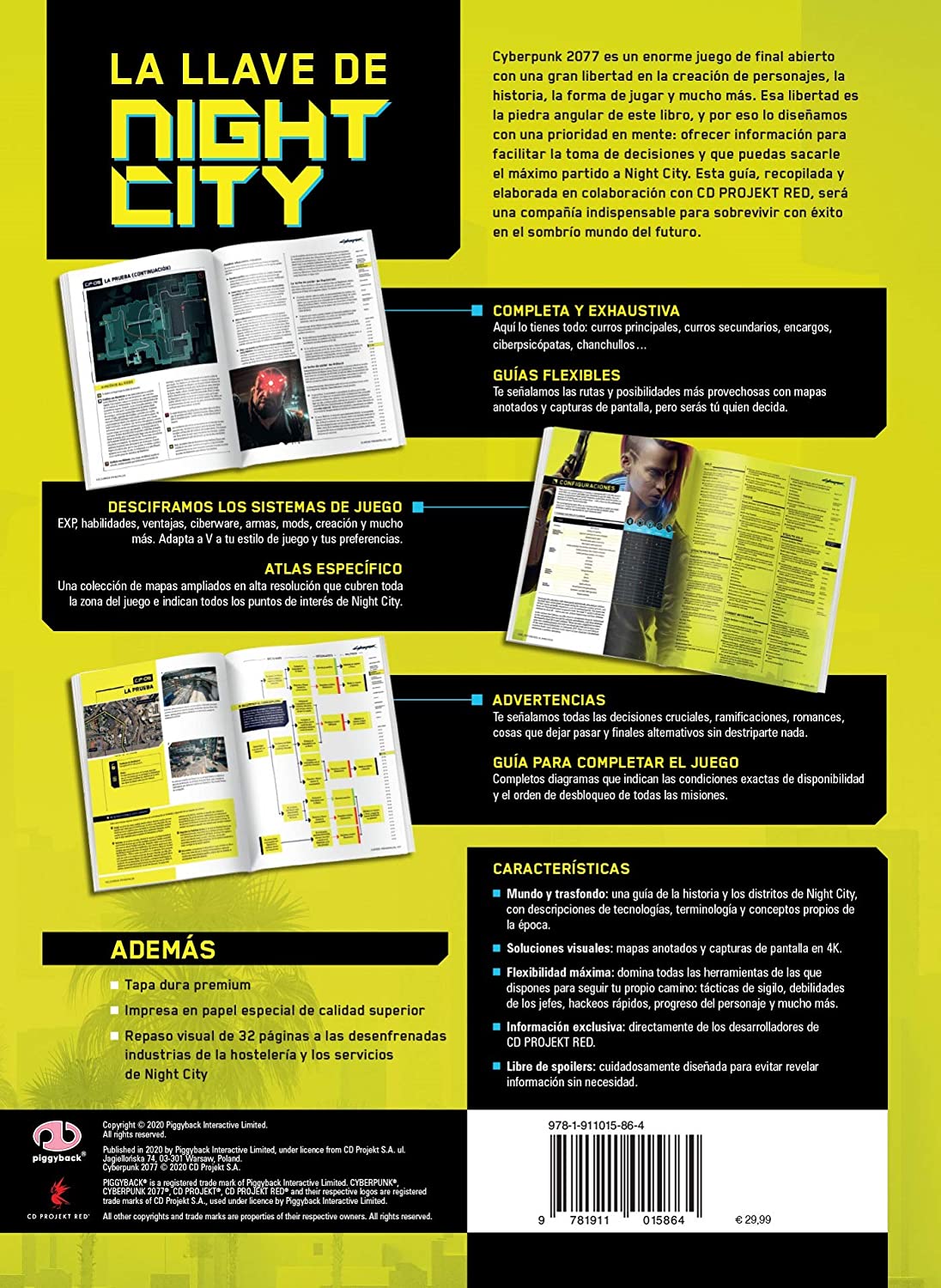 LA LLAVE DE NIGHT CITY Cyberpunk 2077 es un enorme juego de final abierto con una gran libertad en la creación de personajes, la historia, la forma de jugar y mucho más. Esa libertad es la piedra angular de este libro, y por eso lo diseñamos con una prioridaden mente: ofrecer información para facilitar la toma de decisiones y que puedas sacarle el máximo partido a Night City. Esta guía, recopilada y elaborada en colaboración con CD PROJEKT RED, será una compañía indispensable para sobrevivir con éxito en el sombríomundo del futuro.