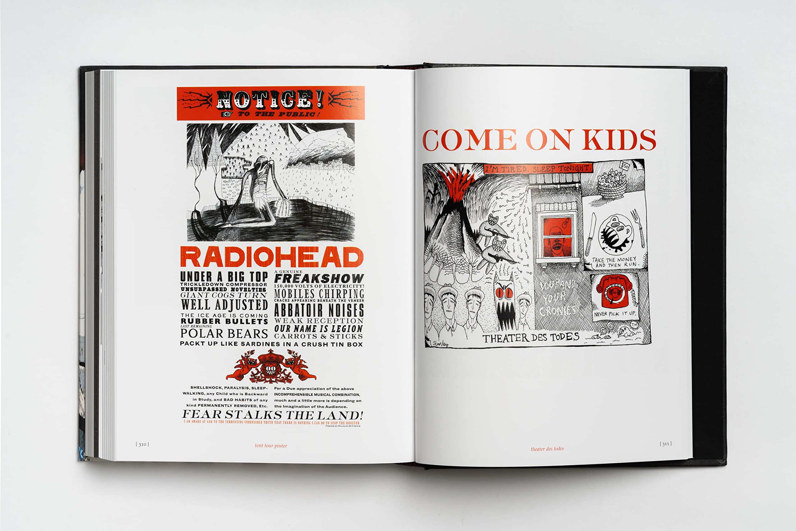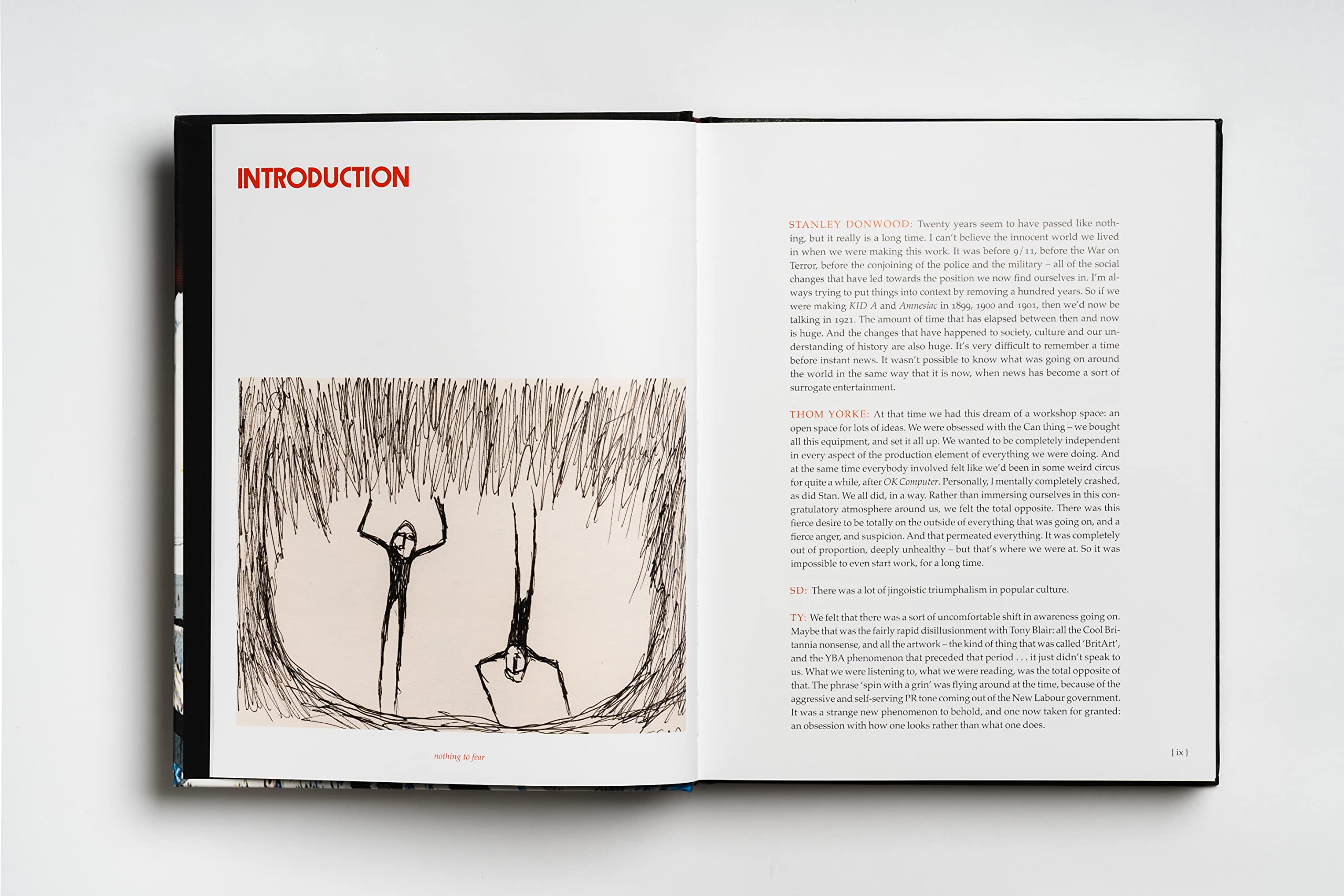 Whilst these records were being conceived, rehearsed, recorded and produced, Thom Yorke and Stanley Donwood made hundreds of images. These ranged from obsessive, insomniac scrawls in biro to six-foot-square painted canvases, from scissors-and-glue collages to immense digital landscapes. They utilised every medium they could find, from sticks and knives to the emerging digital technologies.