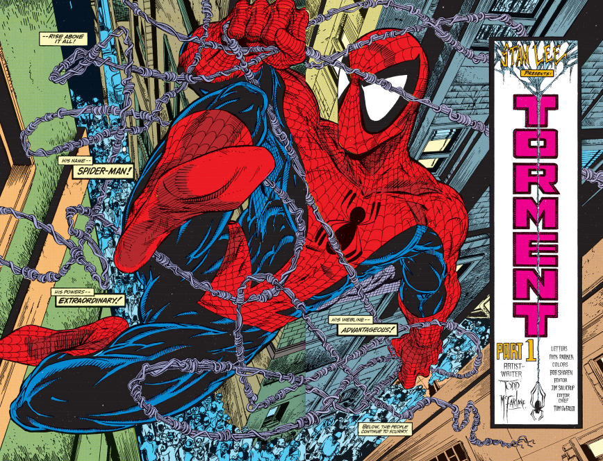 Todd McFarlane became a superstar illustrating AMAZING SPIDER-MAN, but he changed the industry forever with his next project: the «adjectiveless» SPIDER-MAN! Taking on both writing and art duties, McFarlane ushered Peter Parker into a gritty new era – and it began with «Torment»!